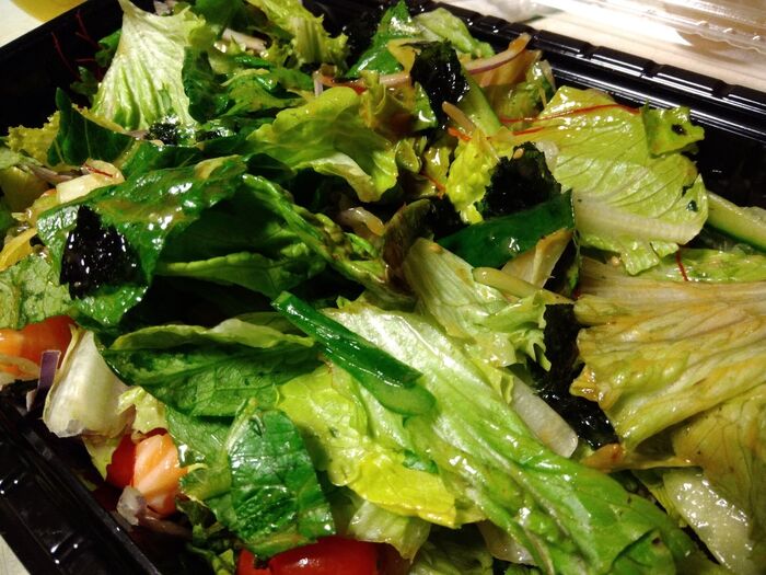 韓国のりを手でちぎってパラパラとサラダにかけて、ドレッシングをサーっとかけて混ぜるだけです。