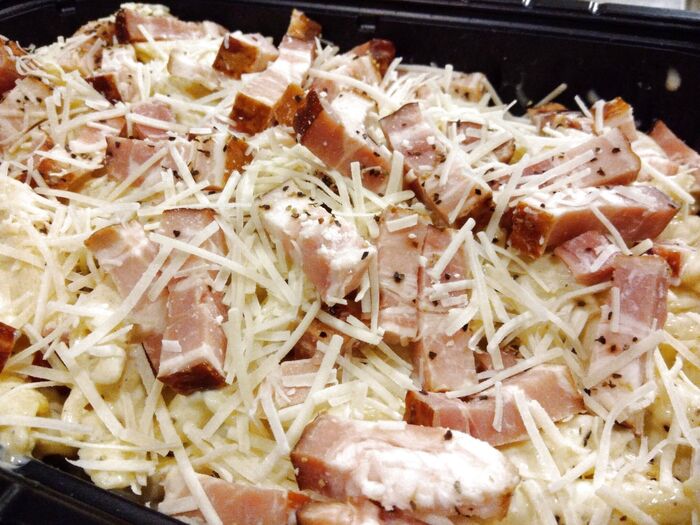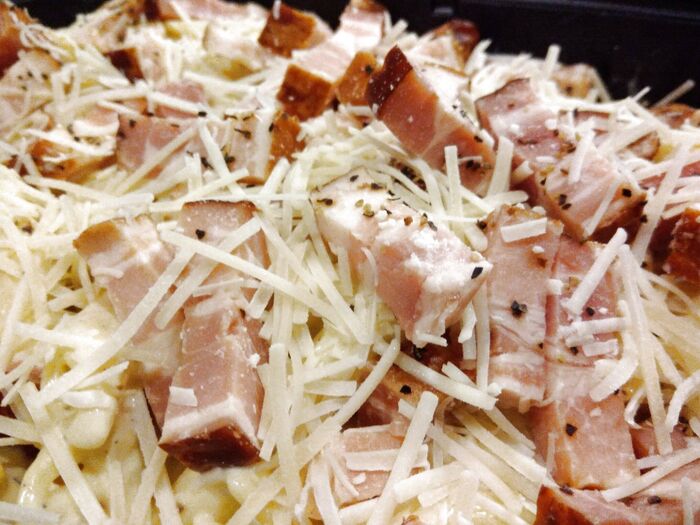 そこにゴロゴロした大きなスモークベーコンが乗っかっていて、黒こしょうとチーズが振りかけられていました。
