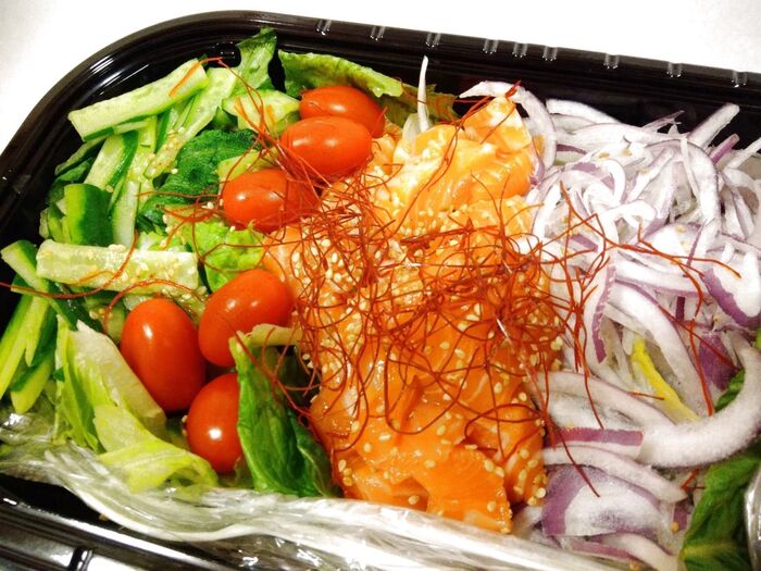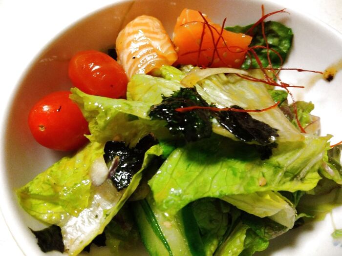 レタスの上に、きゅうり、プチトマト、サーモン、レッドオニオン、糸唐辛子がドーンっと乗っかっていて、そこにゴマがパラパラとふりかかっています。