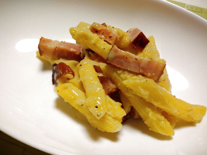 カルボナーラっていうと、なんとなくイメージするのは普通のパスタですが、こちらはペンネが使われています。