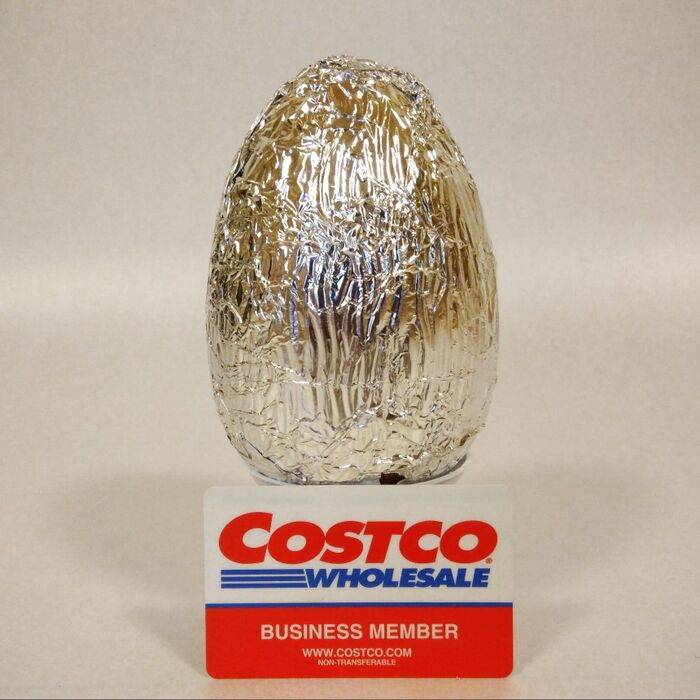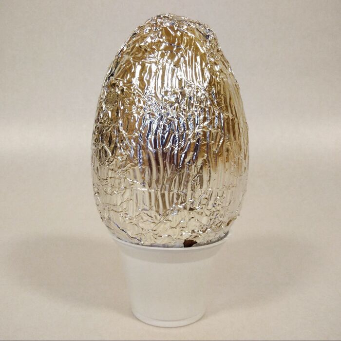 銀色のアルミフォイルに包まれているタマゴのような形の物体があらわれました!倒れないように、ちゃんと下にカップ状の台がついています。
