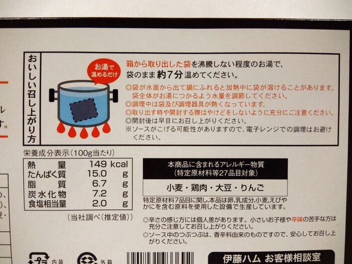 パッケージの裏面に作り方が書いてあるのですが、沸騰しない程度のお湯で、袋のまま約7分温める必要があります。