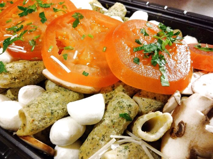 そんなトルティリオーニの上に、パルメザンのコクがきいたバジルソースとモッツァレラチーズ、そしてスライスされたトマトがのっています。