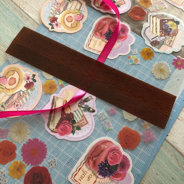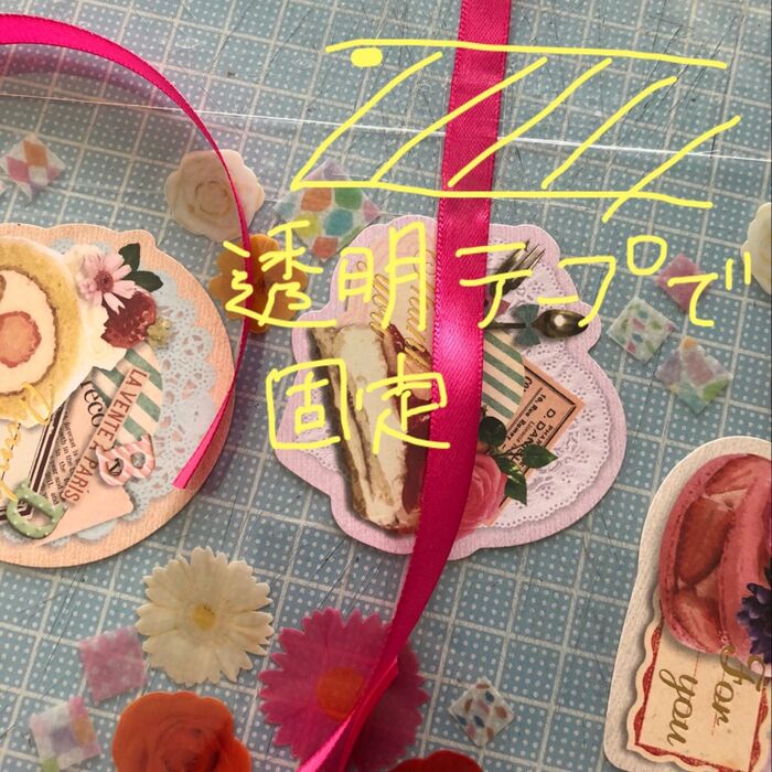シールは透明のフレークシール、リボンはサテンリボン、透明テープ、