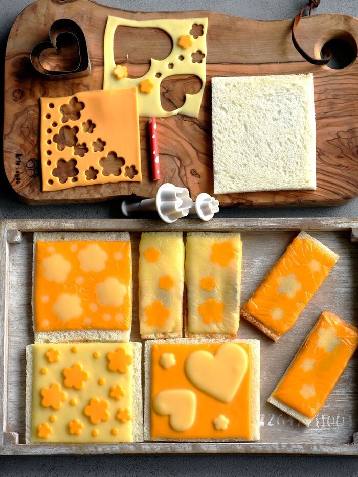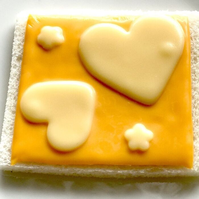 2:大小のハート型(ダイソーで買いました)で、もう一枚のスライスチーズの方を抜き、1にのせる。