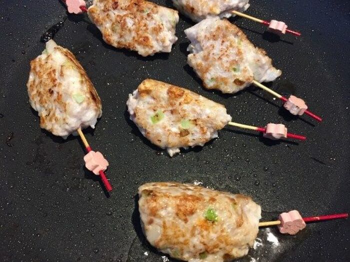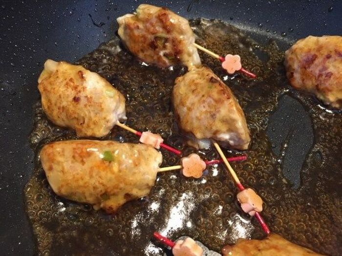 いったんつくねを取り出しaをフライパンに入れひと煮立ちさせ、とろみが出てきたらつくねをもどし、よく絡ませる