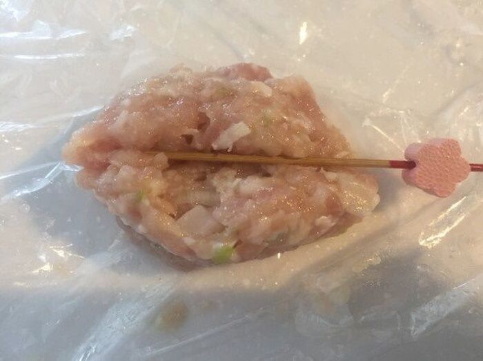 肉だねをを18等分してラップの上にのせ、真ん中に串を置きラップをとじながら断面が三角形になるように成型する