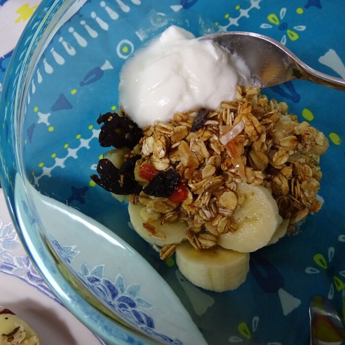 バナナヨーグルト、自家製フルグラ、マヌカハニー少々。