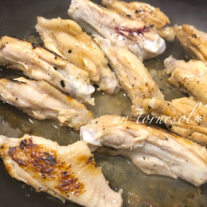 熱したフライパンで②の手羽中を皮面から5分ぐらい焼き、焼き目がついたらひっくり返して約2〜3分焼き、②のつけダレを入れて絡めながら焼けば完成‼︎《中火〜弱火→弱火》