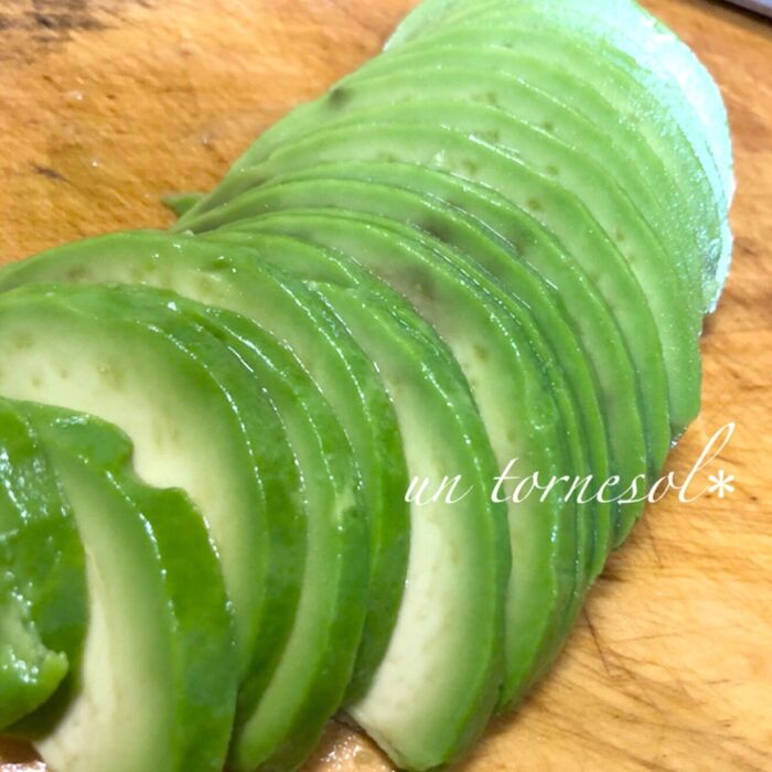 *アボカドは、包丁を一周入れてはずし、包丁の刃先で切り込みを入れて、身と皮の間にスプーンを入れて取り出すと簡単です。