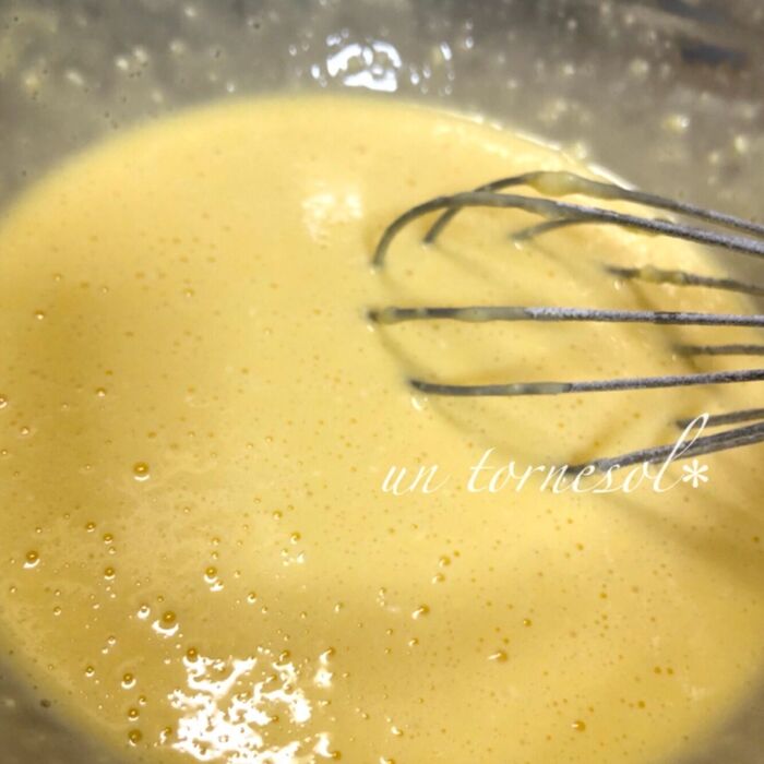 ボウルに卵を割って溶きほぐし、牛乳→オリーブオイルの順に入れながら混ぜ合わせ、薄力粉と塩胡椒・粉チーズを入れて混ぜあわせる。