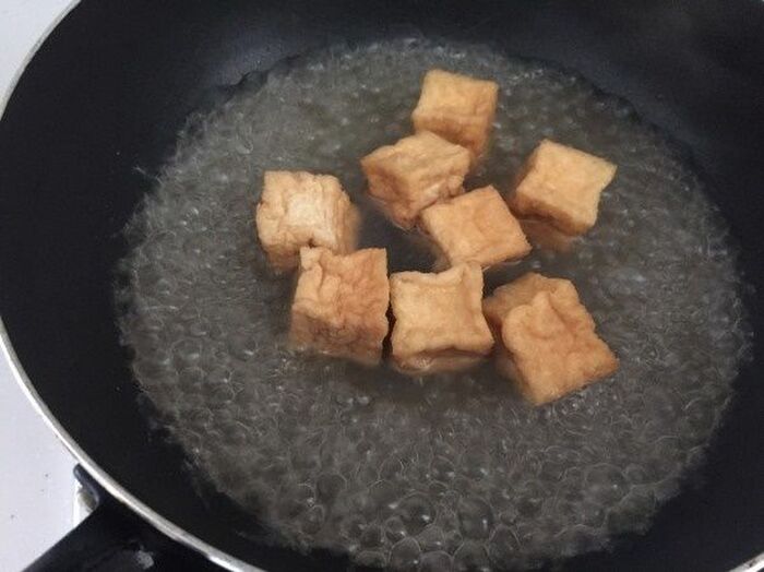 フライパンに白だしと水を入れ、火にかけ沸騰したら8等分にした厚揚げを加え強火で煮ていく