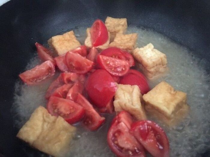 厚揚げに煮汁が吸収されふっくらしてきたら(約4~5分)、6等分したトマトを加える