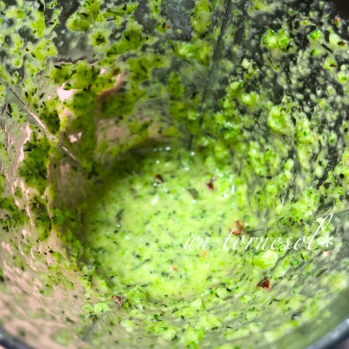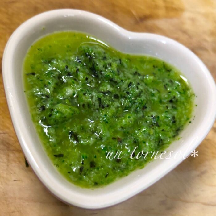 ミキサー(ブレンダー)で、分量の約大さじ1の緑茶を粉砕した後、あら熱が取れたブロッコリーと☆をいれてさらに撹拌する。