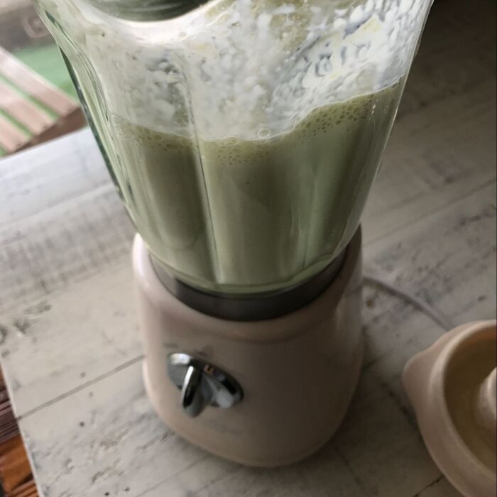 2:アスパラガスを取り出しブレンダーに入れ、牛乳100ml加え滑らかになるまで撹拌し、こし器でこす。