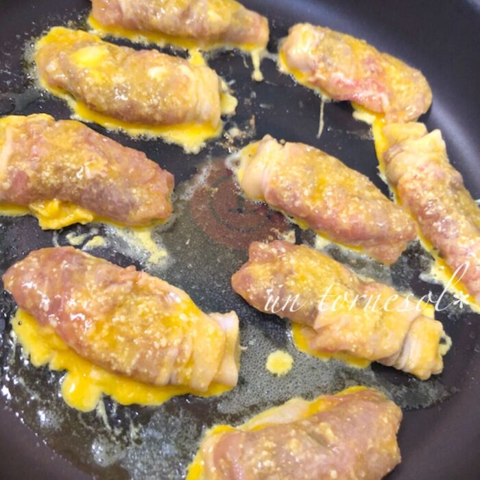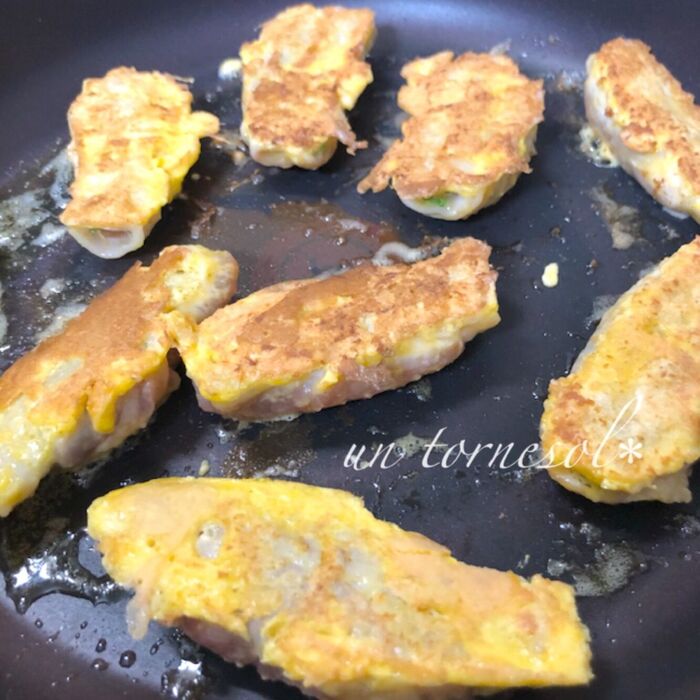③で巻いたものを②にからみつけ、バターを入れて熱したフライパンで焼き、焼き目がついたらひっくり返してフタをし、2分ぐらい焼けば完成‼︎《中火〜弱火》