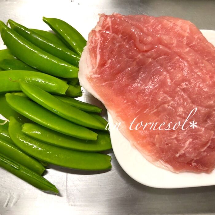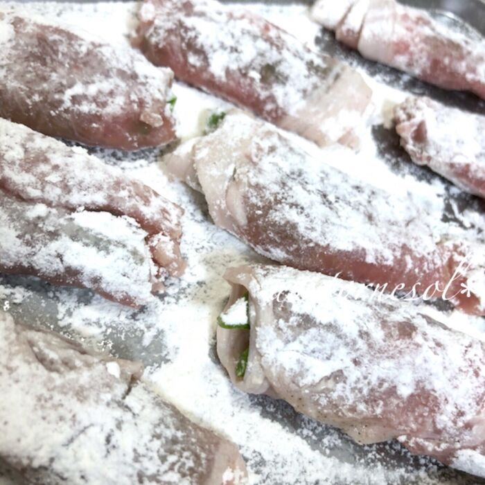 豚ロースに塩・胡椒をし、スナップエンドウをおいて、重ならないように豚ロースを巻いて、薄力粉を薄くつける。