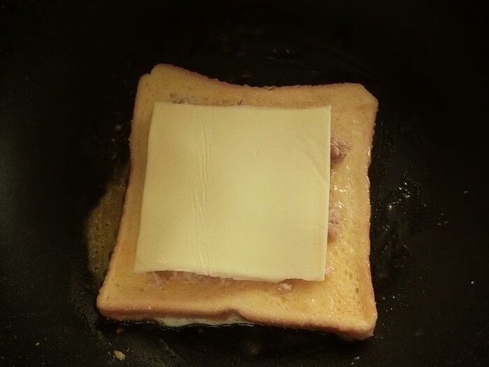 フライパンにバターを入れて溶かし、パンを2枚並べます。ツナ、チーズ、食パンの順に重ねます。