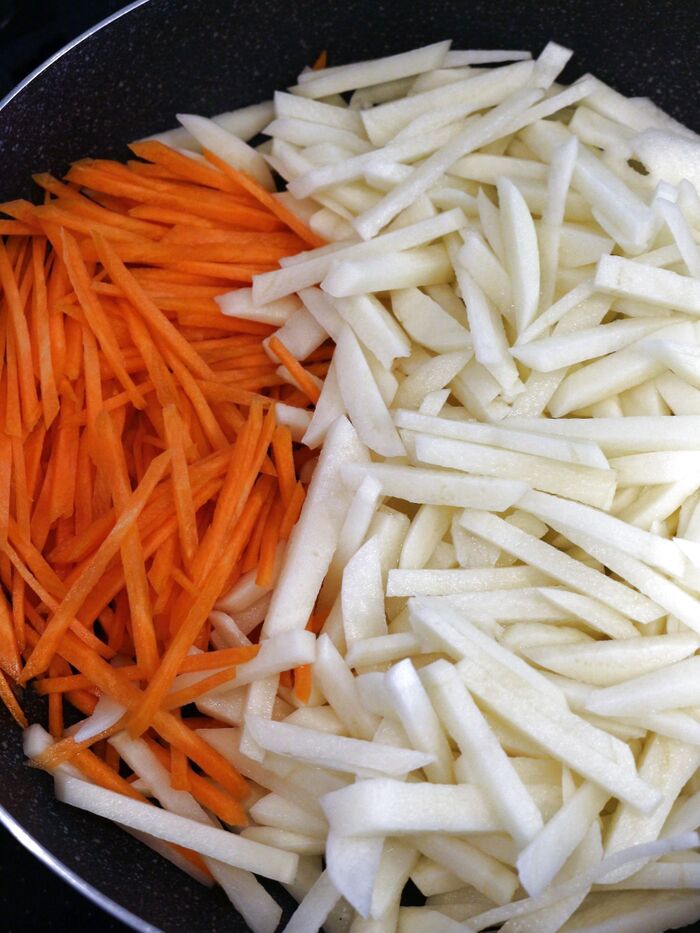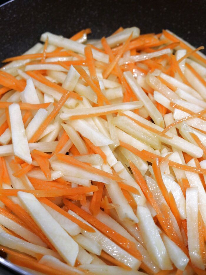 にんじんはじゃが芋の半分の厚さの千切りにする。