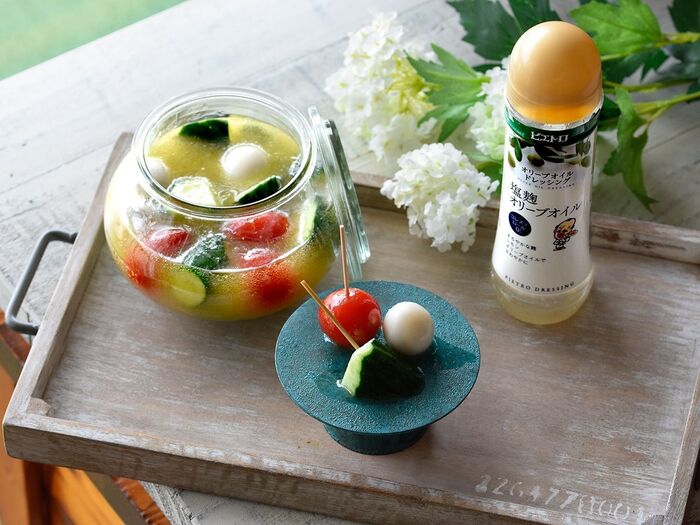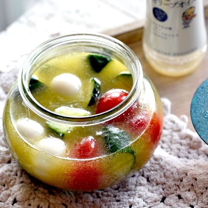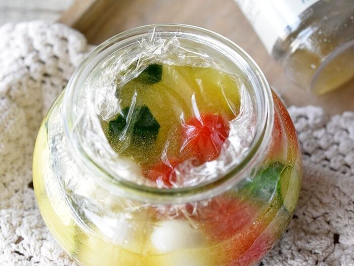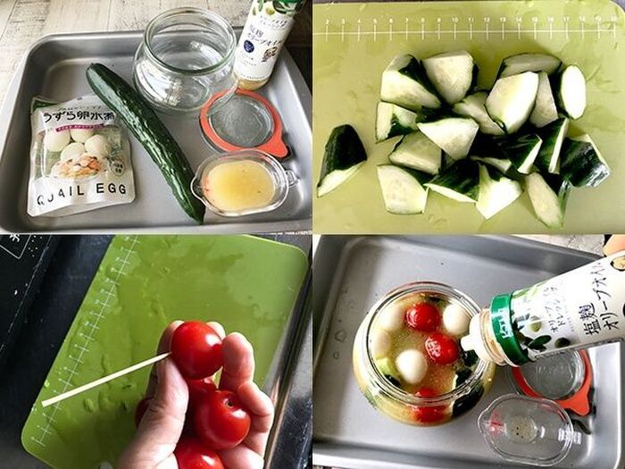 作りかた:清潔な密閉瓶の中に、きゅうり、ミニトマト、うずらのゆで卵を詰め、