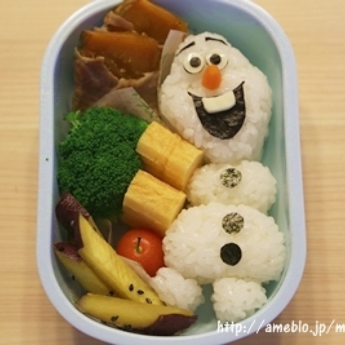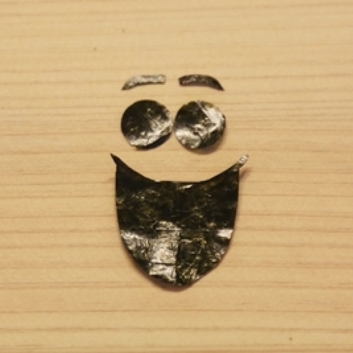 5.3、4のパーツを付け、一回り小さい丸抜いたスライスチーズで白目。海苔で黒目を作ります。