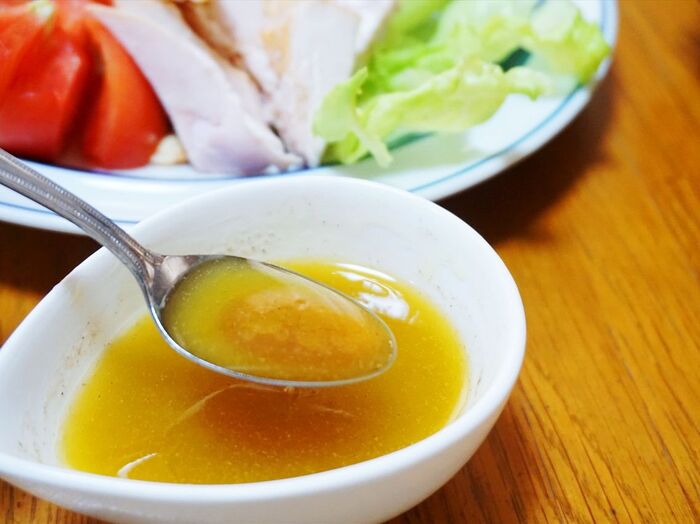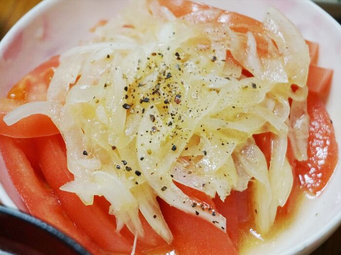 スライスオニオンをこのドレッシングに漬け込んでトマトにかけました。