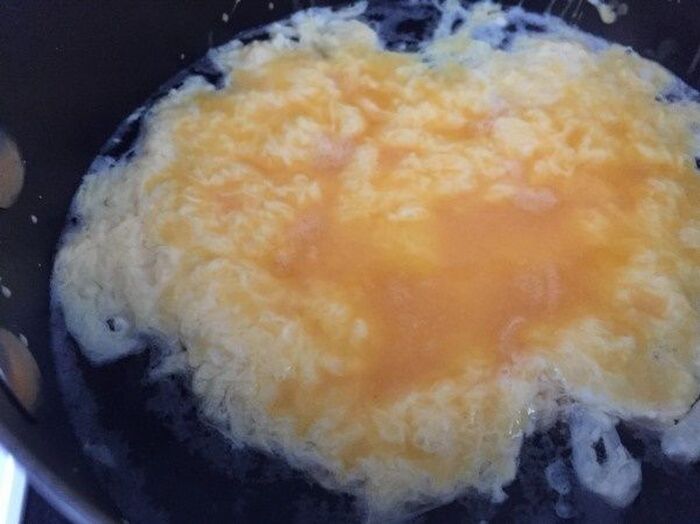 卵を割り溶きほぐして塩を加えて 沸騰させたお湯の中に細く流し入れかき混ぜながら固まってきたら すくいとる