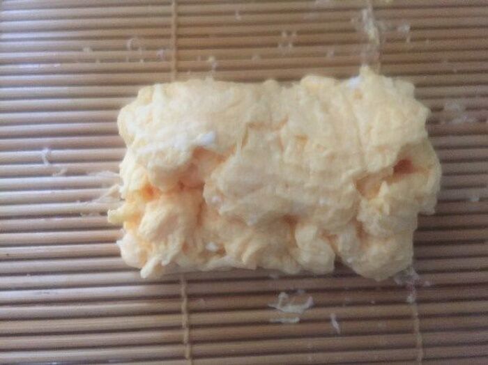 卵の水気を切り熱いうちに巻きすにのせ形を整え 冷めたら4個に切り器に盛り付ける
