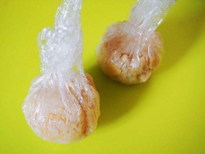 筍ご飯はラップで包んで丸く形を整えます。