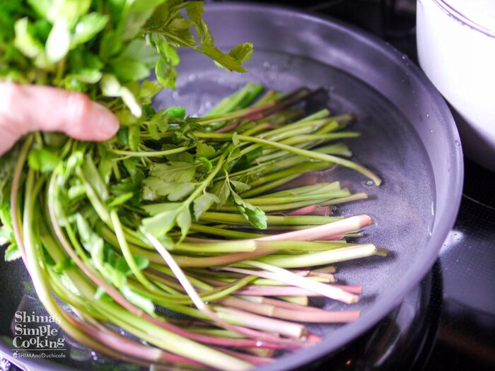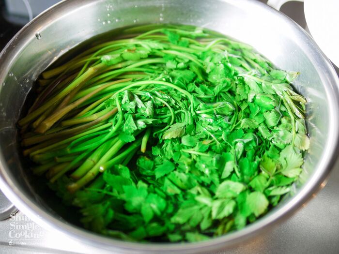 時間がきたら葉の部分を入れ、30秒ほど茹でます。