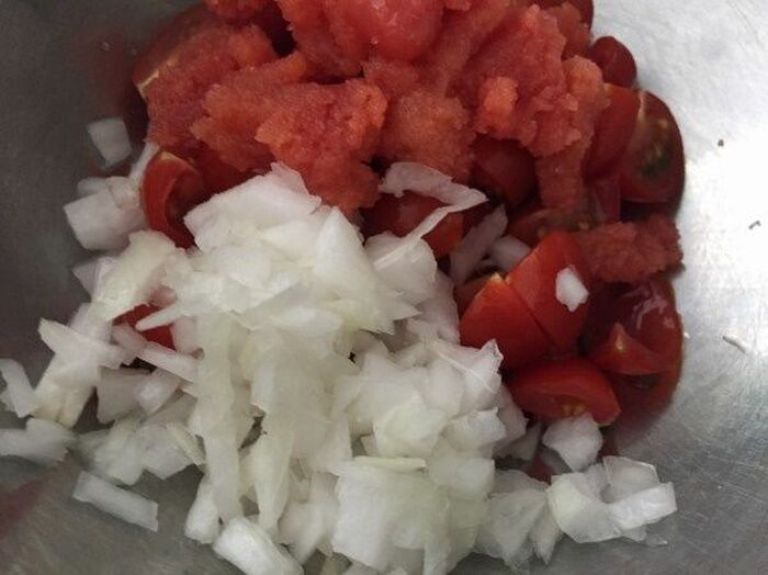 4等分したプチトマト みじん切りの新玉ねぎ ほぐした明太子を混ぜ合わせる