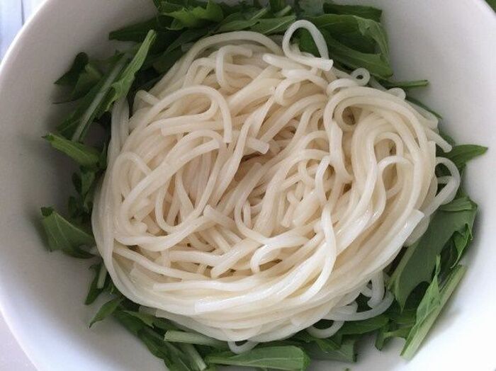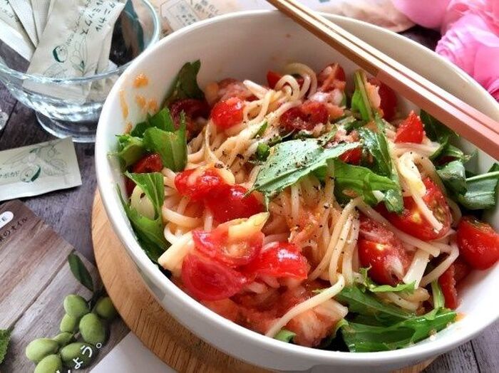 器に食べやすい大きさに切った水菜 茹でて水洗いしたうどん 明太トマトをのせ真ん中に卵黄をのせる