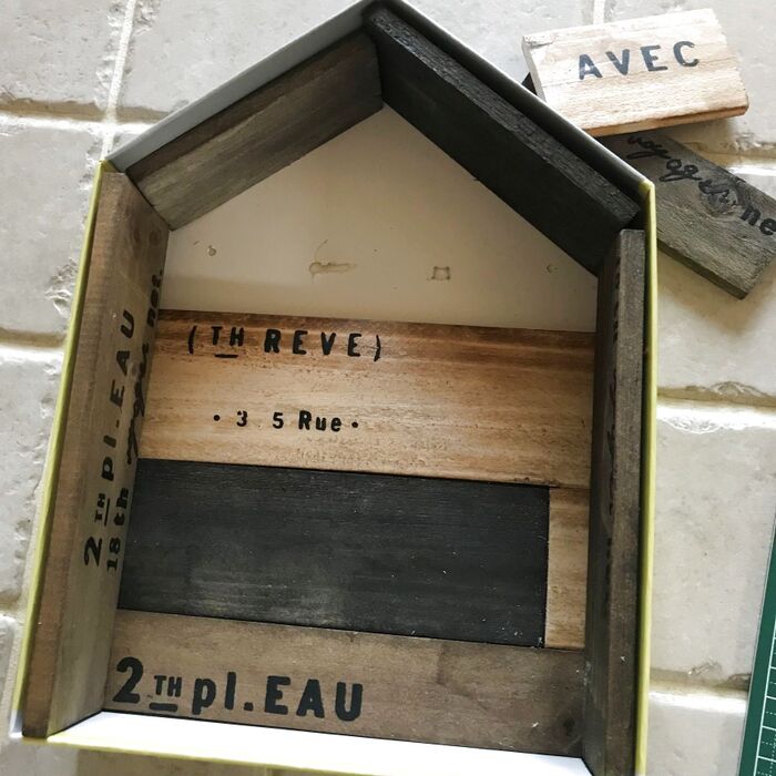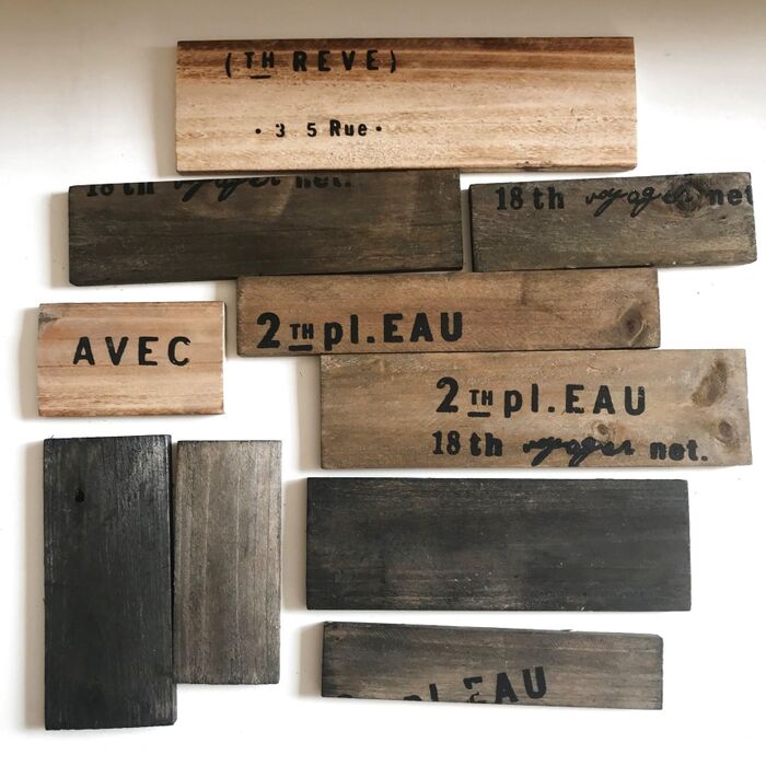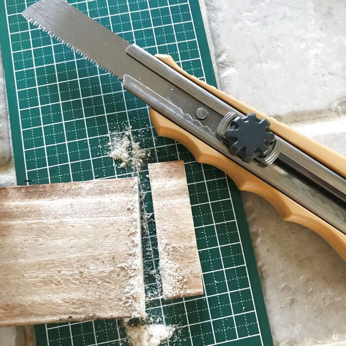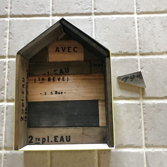 全部はめ込んで、配置が決まったら協力両面テープで貼っていくだけ・・こんな僅かな木片だけがあまって、見事に全部使いきりました♪背面がビンテージ風の収納棚の出来上がり♪