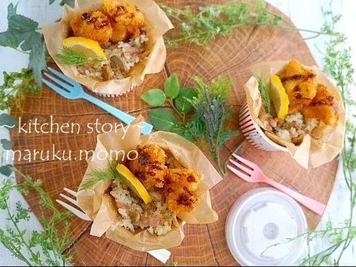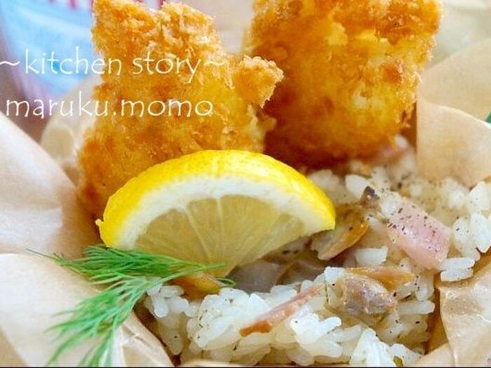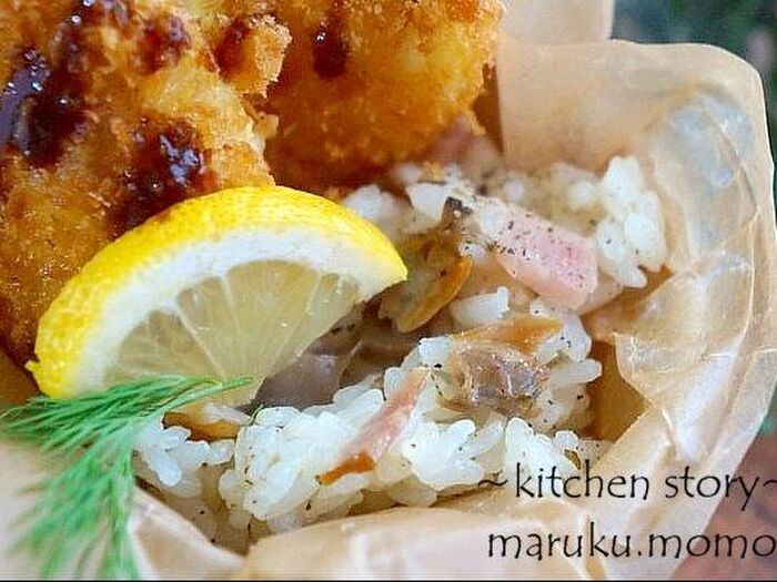 100均の保存パックにワックスペーパーを引き、ボンゴレビアンコ風ライスを詰め、上にタラのフライを乗せます。レモンとハーブがあれば飾ると彩が綺麗になります^^