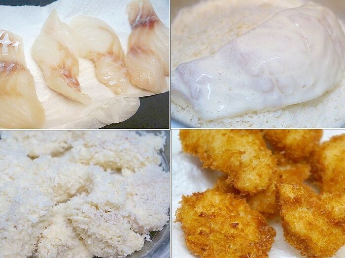 一口サイズにカットしてから、市販の天ぷら粉を水で溶いた中に入れ、パン粉を付け180℃油で揚げます。
