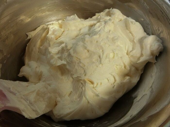 室温で柔らかくしたクリームチーズと残りの砂糖を混ぜ合わせます。