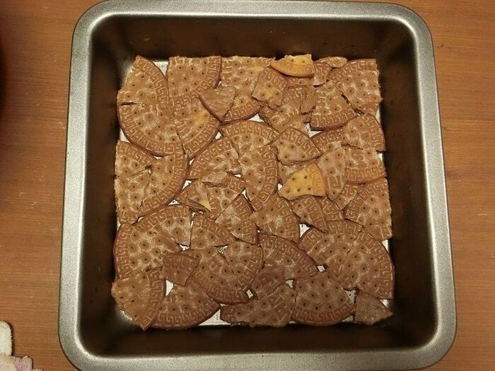 型にビスケットを敷き詰めて、1をまんべんなくかけます。