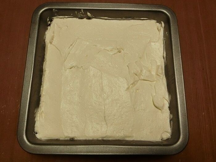 3と4、ラム酒を混ぜ合わせたら、2の型にそっと流し込んで平にします。