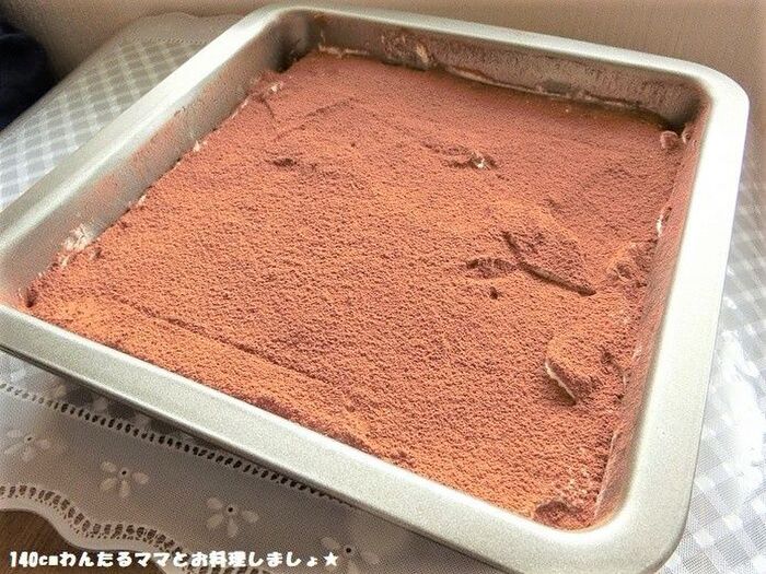 冷蔵庫でしっかり冷やし、食べる直前にココアパウダーを茶こしを使って振りかけて完成♪