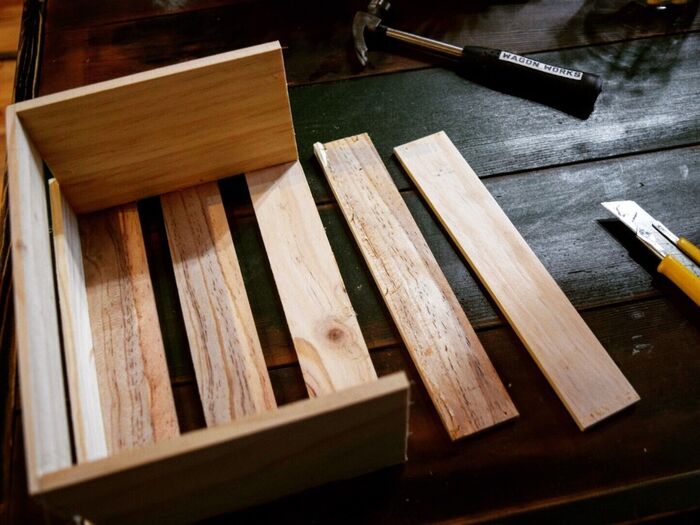 板を外す時に、底と隣接している方はボンドがしっかりとついているので、 無理やり金槌で叩くと割れてしまうことがあるので、 少し、カッター等で切込みを入れておくと外れやすいです。