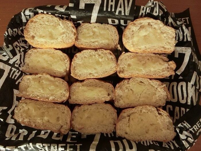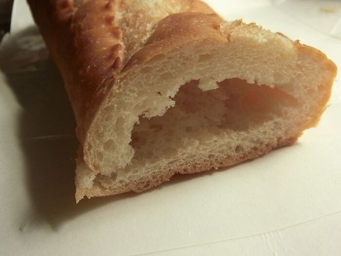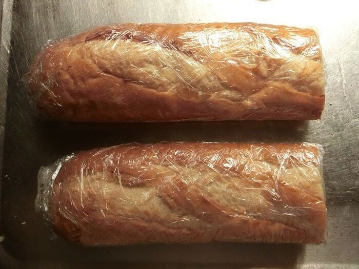 バゲットを半分に切り、中をくりぬいて3を詰めます。
