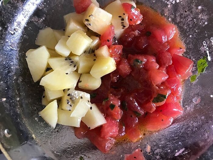 1:キウイフルーツを1cm角に切り、ケッカソースと混ぜ合わせる。