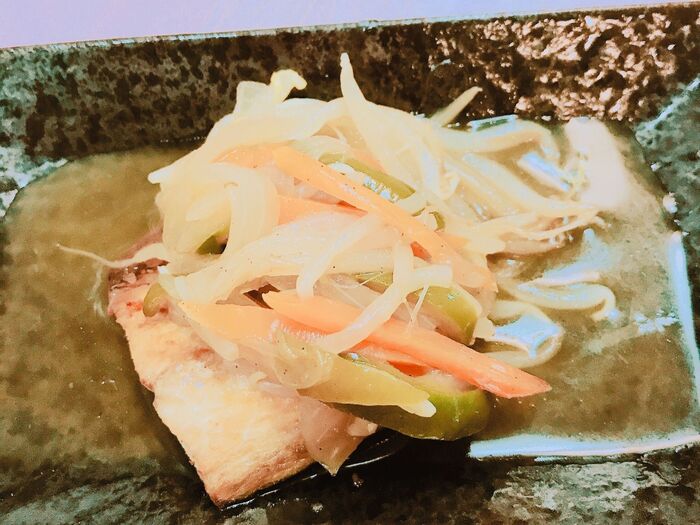 水溶き片栗粉でとろみをつけた餡をサバにかけて出来上がり♬