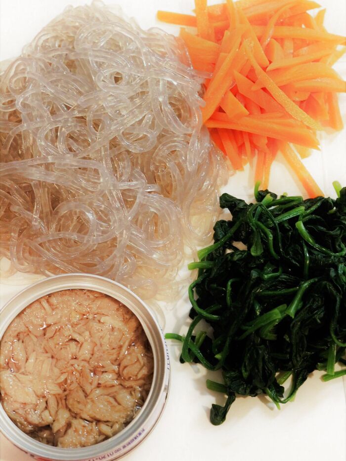 ①春雨、にんじん(細きり)、ほうれん草は茹でて、水気を切っておく。