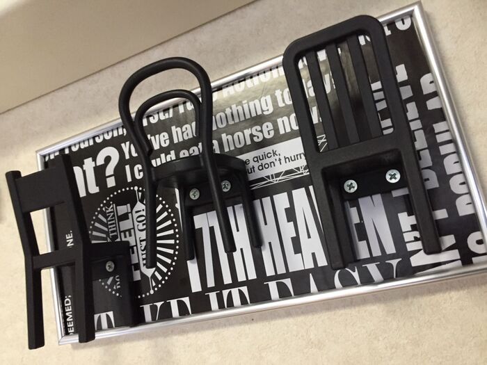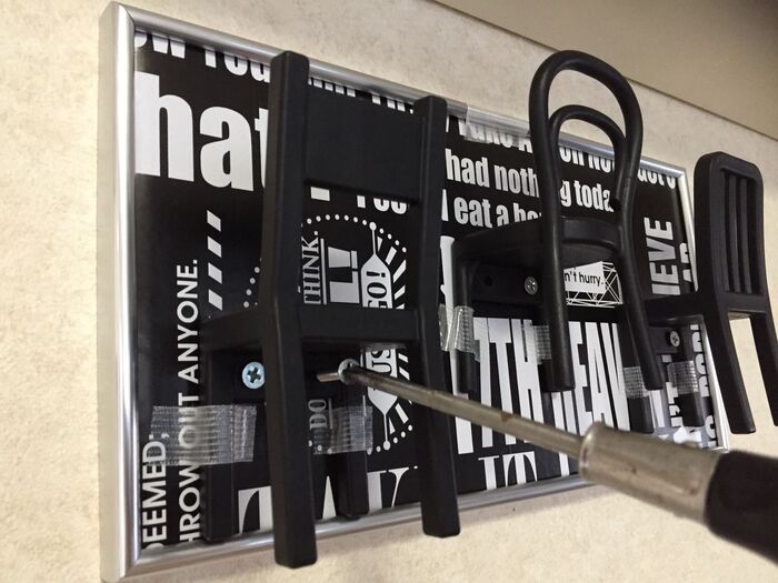 壁に養生テープで仮止めし、椅子型フックのネジ穴⇒ダンボール⇒壁、キリで穴をあけます。