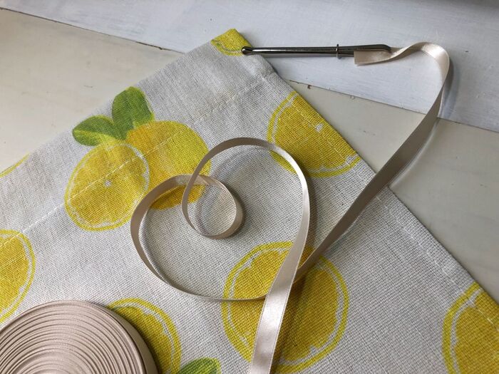 サテンのリボンを100均で買ったゴム通しで入れました♡