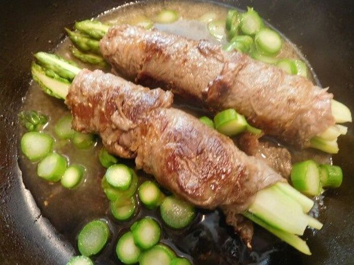 ころがしながら肉全体に焼き色を付け 白ワインと水小口切りのアスパラを加え強火でひと煮たちさせ