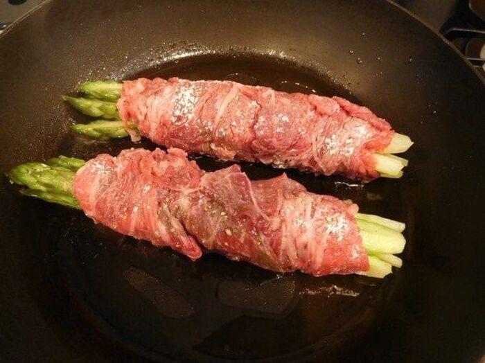 充分に熱したフライパンにオイルを入れアスパラの肉の巻き終わりを下にして焼く