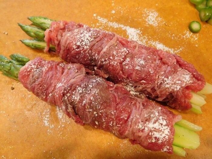 牛肉を広げアスパラガス5本を置いて巻き付け塩・コショウ 小麦粉を薄くふる