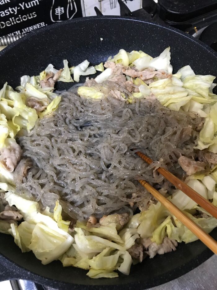豚肉、キャベツなど具材を一口大に切り、糸こんにゃくはザルにあけ軽く水洗いしたら食べやすい長さに切ります。